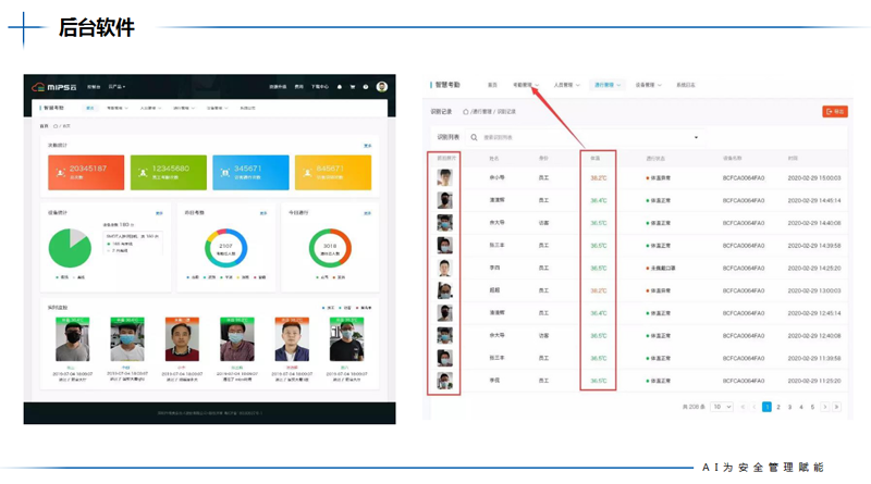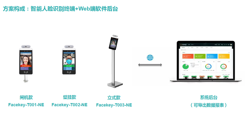 方案配备的8英寸LPS全视角LCD显示屏分辨率为1280*800,在显示来访者影像的同时显示软件界面与操作提示,并支持1米距离信息采集、多种API对接、二次开发等功能,可根据企业实际需求定制专属应用程序接口。 依托FaceKey-T001-NE智能人脸识别测温终端的深度学习算法,管理员将身份信息输入后台即可实现来访者免摘口罩显示体温、姓名、打卡功能。在Web端软件后台,来访者身份、体温等数据可通过后台实时查询,如遇体温过高来访者,系统还将自动预警,为部署企业提供智能化健康保障。