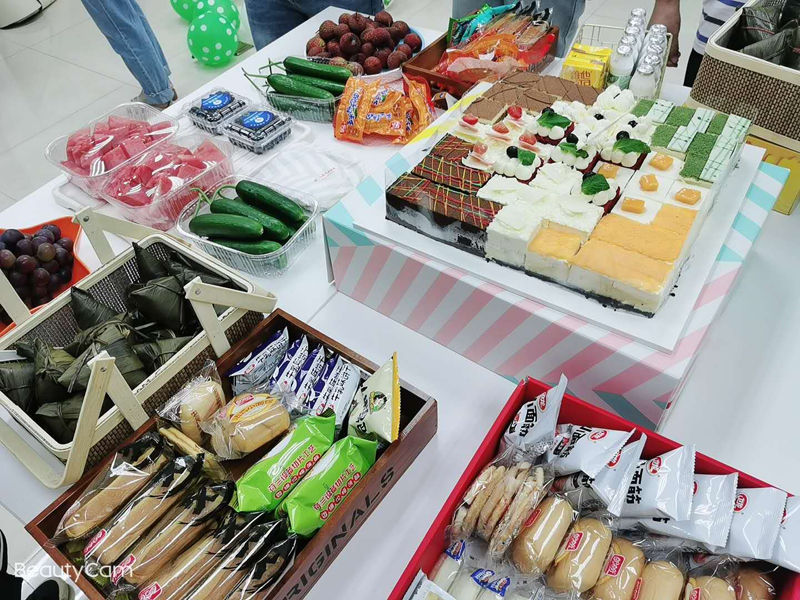 由于生日会次日即将迎来中华民族传统节日——端午节,因此公司在生日蛋糕、零食糕点等冷餐美食外还特意准备了豆沙、蜜枣、烧肉等多种口味的即食粽子。员工们共话端午风俗,共享粽香美味。同时,本次活动正值疫情期间,公司将员工们的健康安全放到首位,取餐时严格执行分批次、控间隔等多种要求,把好健康关。