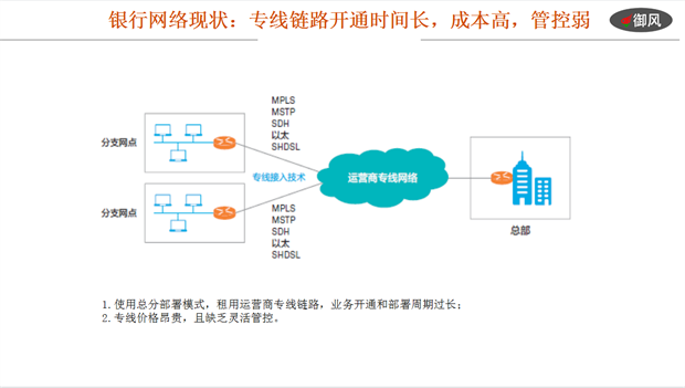 ​由于需要更稳定可靠的交易过程,金融业的广域网一直以来都采用专线网的模式,虽然价格居高不下,但还算成熟,稳定。随着业务数据类型的不断发展变化,特别是疫情以来更是催生和推动了VOIP、电子视频面签、视频会议以及移动端APP增值类数据的持续高速增加。让使用总分部署、价格昂贵但周期过长、维护程序繁琐的专线网越来越不能满足要求。