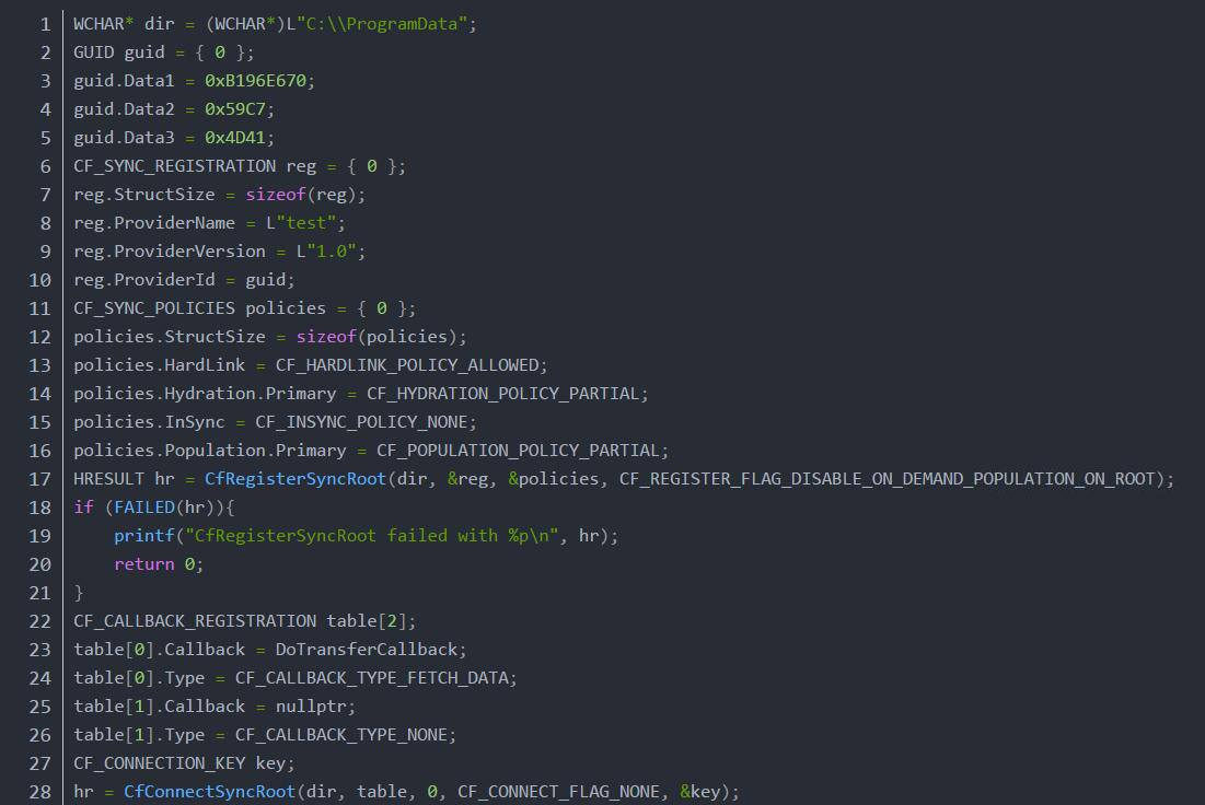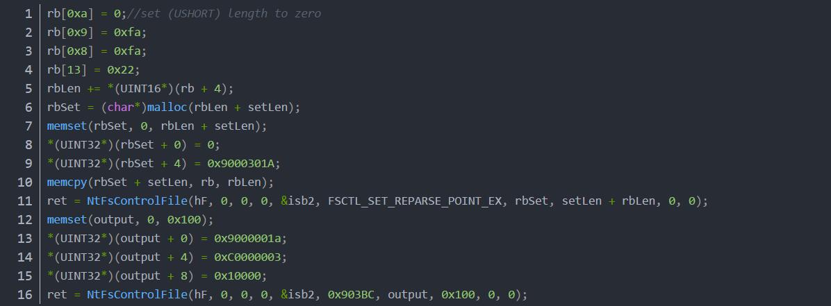 3:修改检索到的重解析数据,将长度设置为零。然后通过FSCTL_SET_REPARSE_POINT_EX控制代码将其设置回原位(标签设置为 0x9000301A,即IO_REPARSE_TAG_CLOUD_3)。最后,设置参数以code= 0xC0000003通过cloud filter FSCTL ( 0x903BC)请求占位符更新。