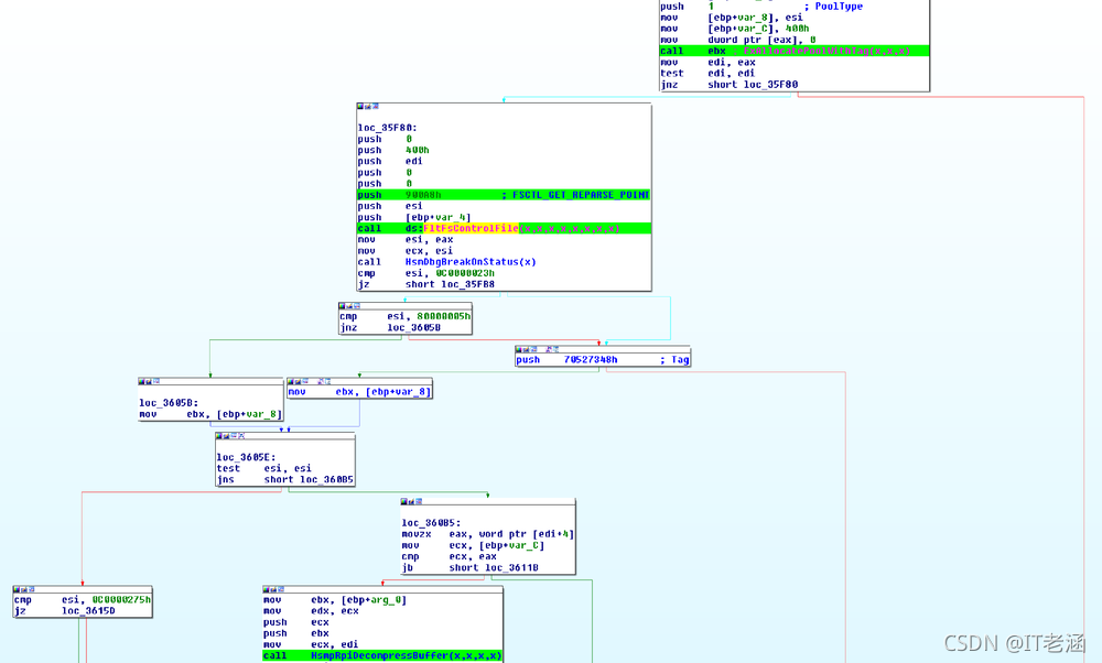 经过一些处理,执行流程将达到HsmpRpReadBuffer。首先分配一个缓冲区,然后通过发出一个FSCTL_GET_REPARSE_POINT控制指令来检索重解析数据。检索到的数据可能已被攻击者修改,之后调用HsmpRpiDecompressBuffer: