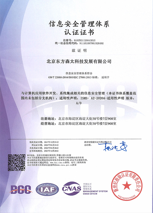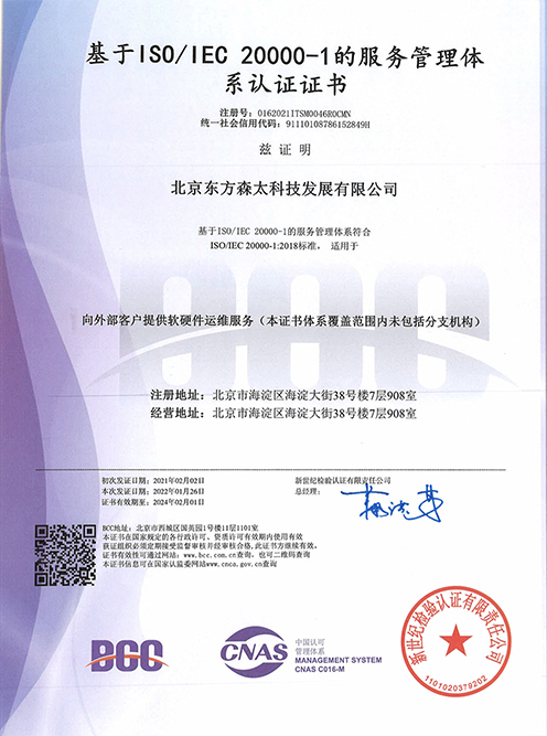 再次通过“ISO/IEC20000-1的服务管理体系”、“信息安全管理体系”双认证,标志着东方森太信息技术服务管理水平和信息安全能力再次得到认可,为广大用户提供优质高效、安全可靠的产品和平台运营及软硬件运维服务。