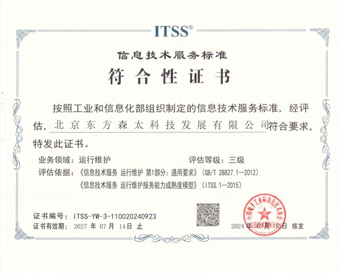 近日,经中国电子工业标准化技术协会信息技术服务分会评估认证,北京东方森太科技发展有限公司(以下简称“东方森太”)符合工业和信息化部组织制定的信息技术服务标准,荣获ITSS信息技术服务标准运行维护三级证书。