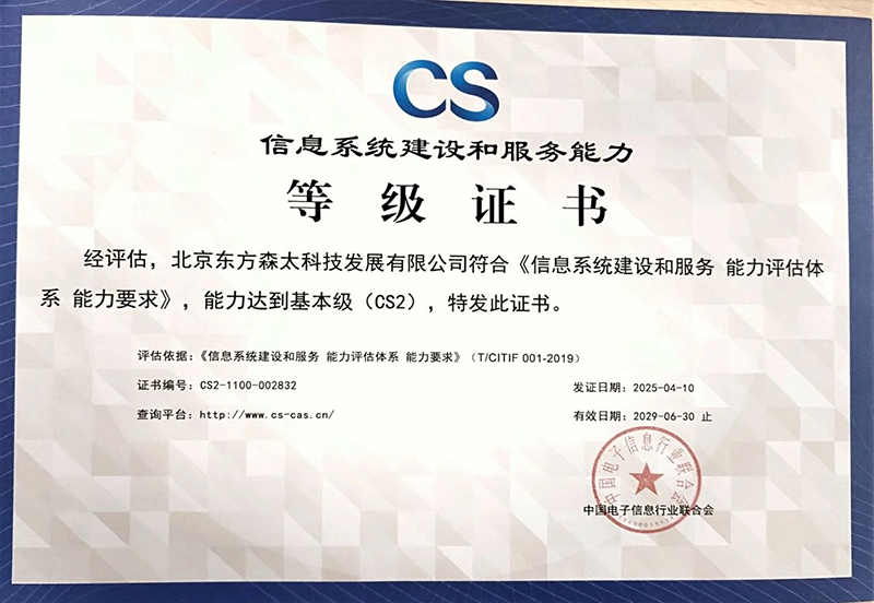 CS 认证由中国电子信息行业联合会主导,是对企业在信息系统建设和服务领域综合实力的全面考核,涉及经营状况、人才储备、技术水平、管理效能及创新能力等多个维度。CS 二级认证要求企业具备一定规模,同时在资信状况、知识产权保护以及项目履约方面表现出色。东方森太顺利通过认证,标志着公司在信息技术咨询、软件开发、信息系统设计与集成实施等业务上,已达到行业领先水准。无论是过往为中小企业打造的定制化信息化方案,还是如今为政企、金融行业构建的大型复杂系统,都彰显了公司过硬的项目交付能力与优质服务水平。这一认证将助力东方森太在激烈的市场竞争中脱颖而出,尤其是在政府投资项目与商业招标中,进一步拓展市场版图,提升品牌美誉度。
