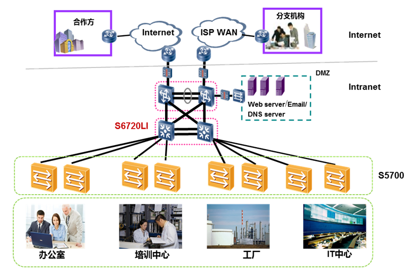 S6720-LI可用于中小型园区网的接入或者汇聚,其业界领先的高密度全线速万兆端口,顺应网络带宽需求日益膨胀的趋势;其丰富的业务特性、完善的安全控制机制使得S6720-LI成为园区交换机高性价比的选择。