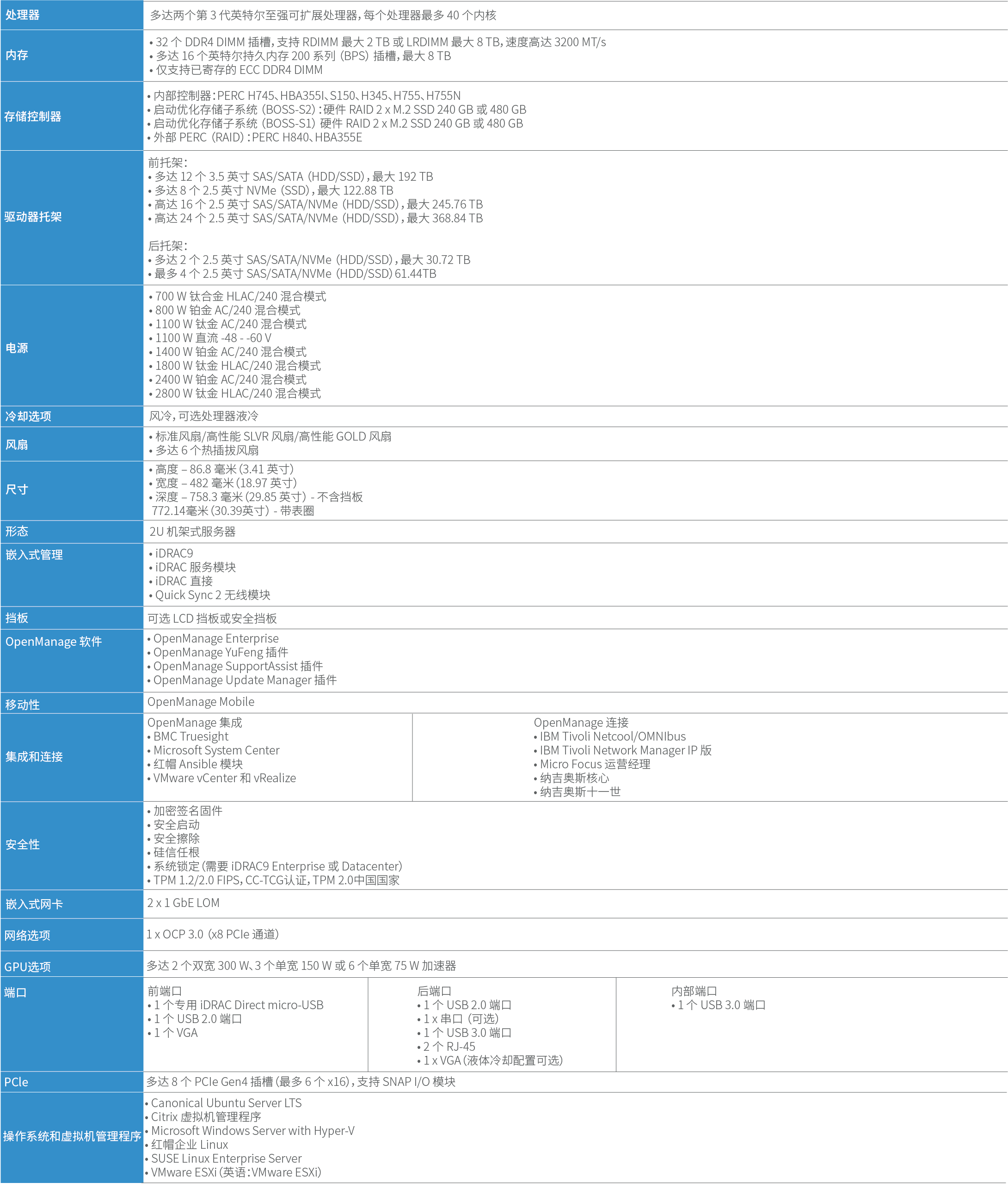 解决应用程序性能和加速问题。 YuFengR750是一款双插槽/2U机架式服务器,可为要求最苛刻的工作负载提供出色的性能。它支持每个 CPU 的 8 个内存通道,以及多达 32 个 DDR4 DIMM @ 3200 MT/s 速度。此外,为了解决吞吐量的大幅提高问题,YuFeng R750支持PCIe Gen 4和多达24个NVMe驱动器,具有改进的风冷功能和可选功能直接液体冷却,支持日益增长的功率和热要求。这使得YuFeng R750成为适用于各种工作负载的数据中心标准化的理想服务器,包括:数据库和分析、高性能计算 (HPC)、传统企业 IT、虚拟桌面基础架构和 AI/ML 环境需要性能、广泛的存储和 GPU 支持。