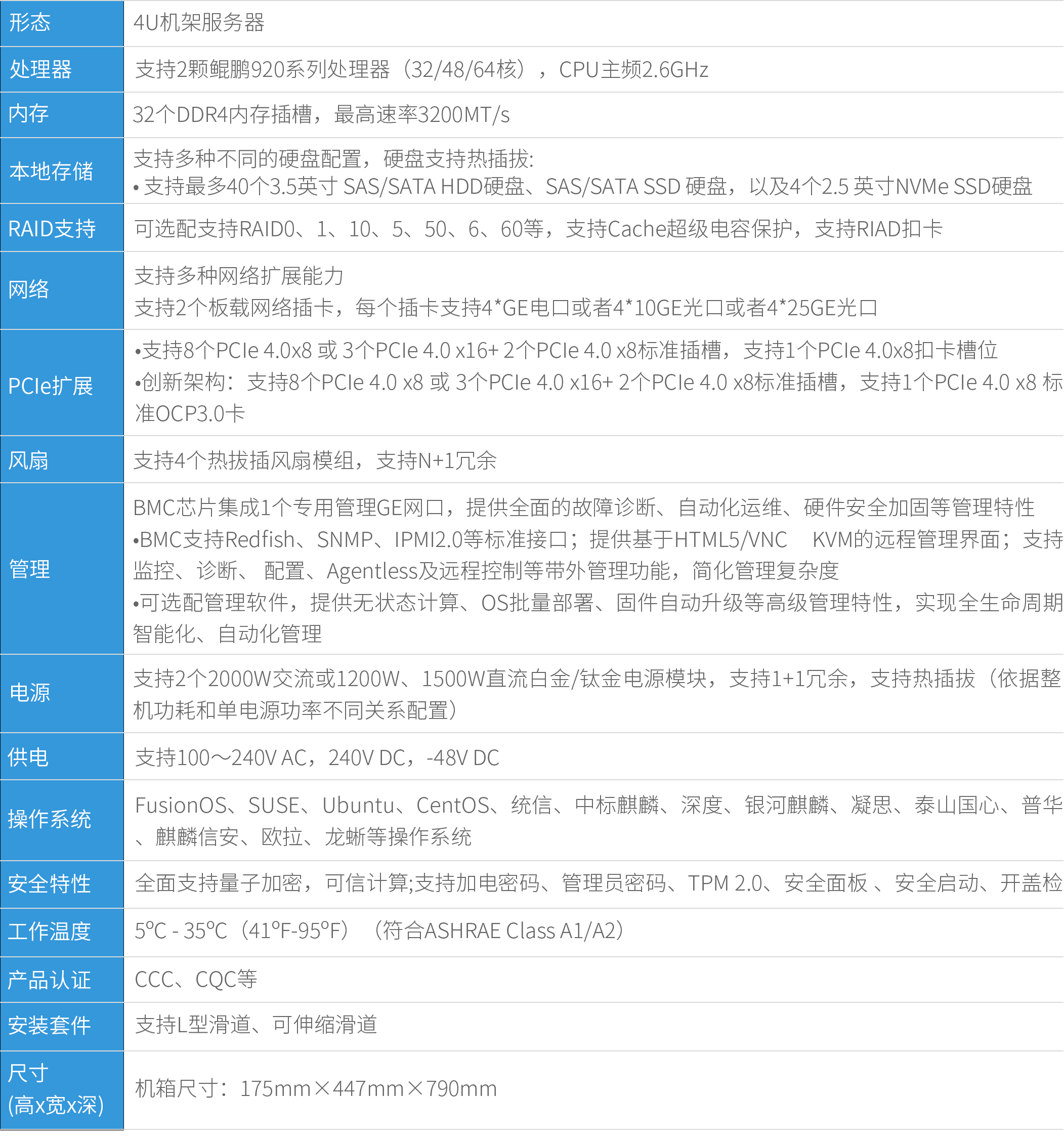 • 支持2颗鲲鹏920处理器,单CPU最高支持64个计算核心