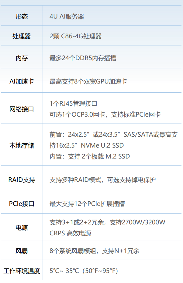 ·最高配置8张双宽AI加速卡,满足高密度AI算力应用需求,适用于大规模集群部署;
