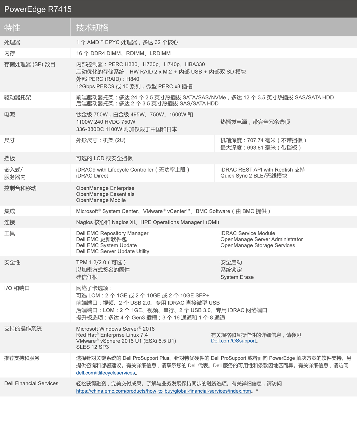 PowerEdge R7415通过单路设计提供经济实惠的可扩展性。增添充足的存储和内存容量,满足要求苛刻的工作负载的需求。R7415采用企业级AMD EPYC™处理器,通过单处理器设计提供软件定义存储或业务分析。
